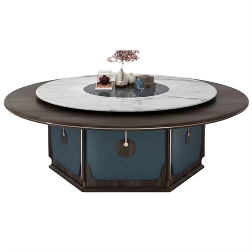 這款12人14人位新中式電動(dòng)餐桌大圓桌設(shè)計(jì)簡約大方,符合現(xiàn)代審美,又不失中式傳統(tǒng)的韻味,適合各種場合使用,如家庭、酒店、會(huì)所、飯店等。臺(tái)面選用選用優(yōu)質(zhì)的實(shí)木材料,經(jīng)過多道工藝處理,保持了木材的天然紋理和色澤,結(jié)實(shí)耐用,防潮防蛀。餐桌轉(zhuǎn)盤選用大理石巖板,表面光滑平整,耐磨耐刮,易于清潔,不易滋生細(xì)菌,環(huán)保健康。