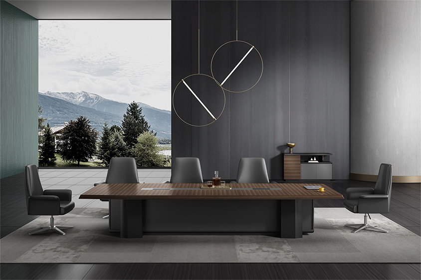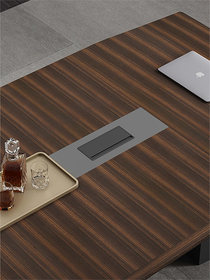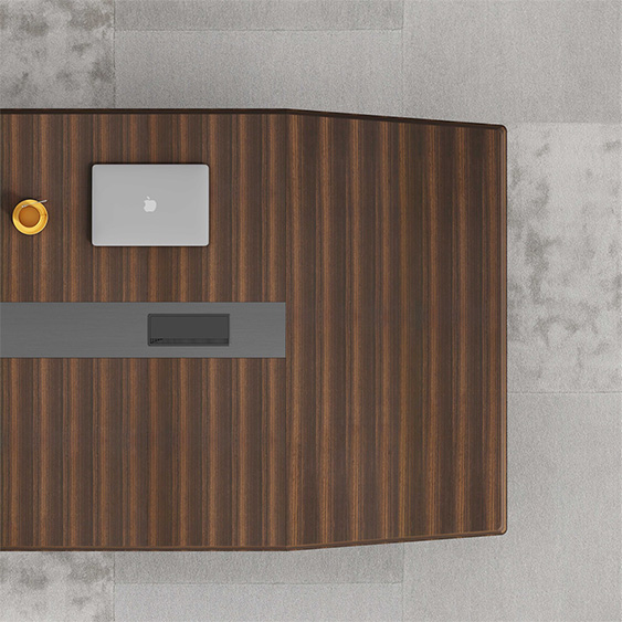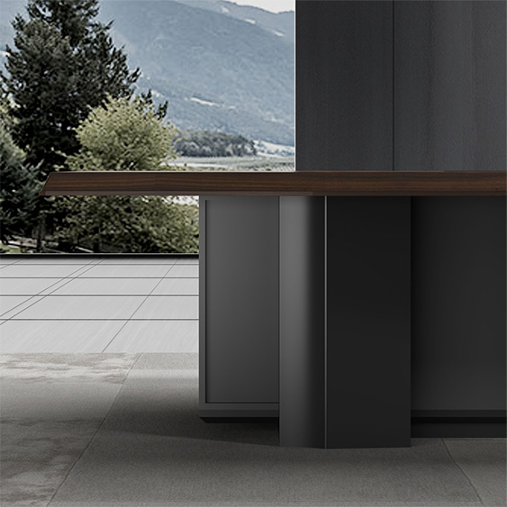 浩韻系列  深邃神秘,時(shí)尚富有魅力。態(tài)勢(shì)沉穩(wěn)又不失靈動(dòng),富有個(gè)性而不張揚(yáng)。設(shè)計(jì)靈感源于建筑的傾斜式支撐給人帶來(lái)的沖擊感。不同材質(zhì)的相互碰撞,實(shí)木結(jié)合金屬嵌件,充滿現(xiàn)代氣息。在現(xiàn)有的辦公功能上結(jié)合隱藏的電動(dòng)升降臺(tái),將科技與美學(xué)完美結(jié)合,打造時(shí)尚簡(jiǎn)潔的現(xiàn)代化辦公空間。