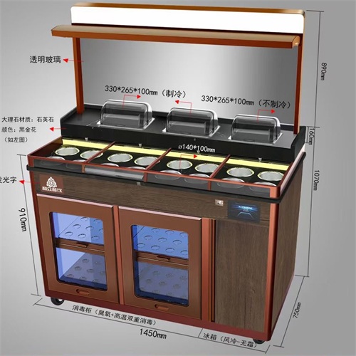以滑蓋保鮮、風冷保鮮、高溫+臭氧消毒功能,解決了醬料在常溫下開放式存放、碗碟露天存放等食安隱患問題;運用強大的智能操控系統(tǒng),讓調(diào)料區(qū)管理更高效;支持多種功能、風格定制,打造餐企專屬料臺。