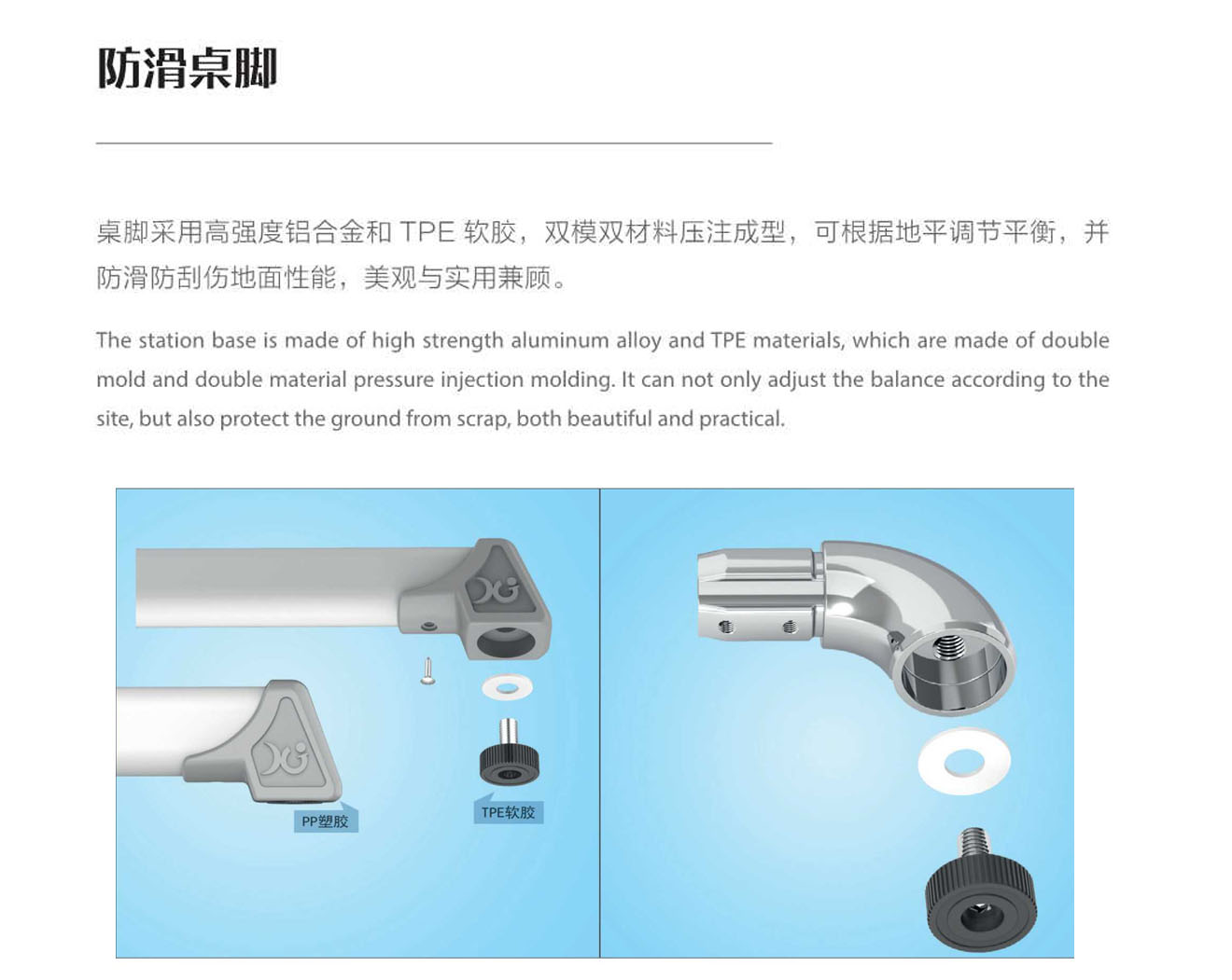 5.桌腳掌套底有4個(gè)平衡調(diào)節(jié)機(jī)構(gòu)。