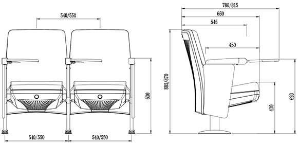 2.座椅基本中心距為540±5mm,座包打開側(cè)深650±5mm,寫字板打開側(cè)深780±5mm,基本椅高為870±5mm,最小排距:800mm。