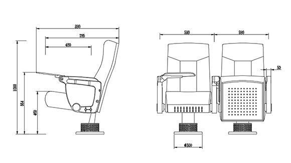 座椅深度:880±10mm,扶手高664±10mm:最小排距:900mm。