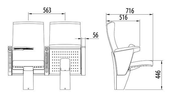 2.座椅基本中心距為563±5mm,座包打開側(cè)深716±5mm,寫字板打開側(cè)深770±5mm,基本椅高為1010±5mm,最小排距:900mm。